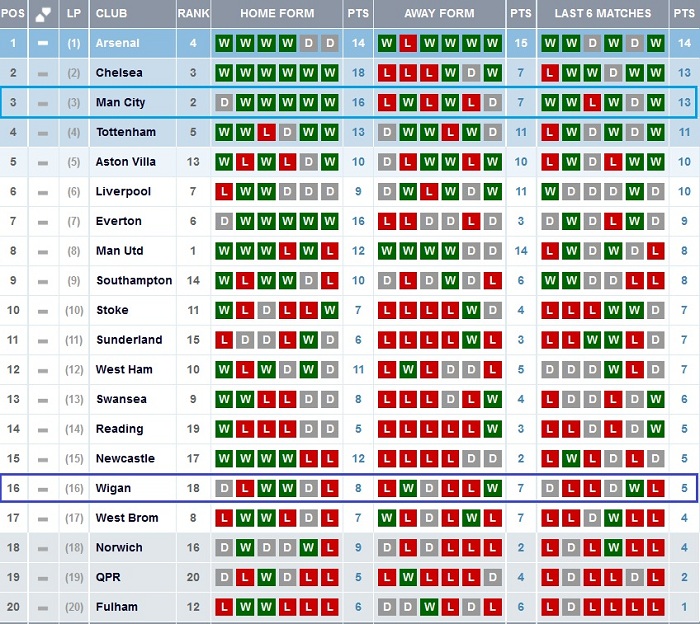 ตารางคะแนนเปรียบเทียบฟอร์ม 6 นัดล่าสุดของสองทีมในพรีเมียร์ลีก