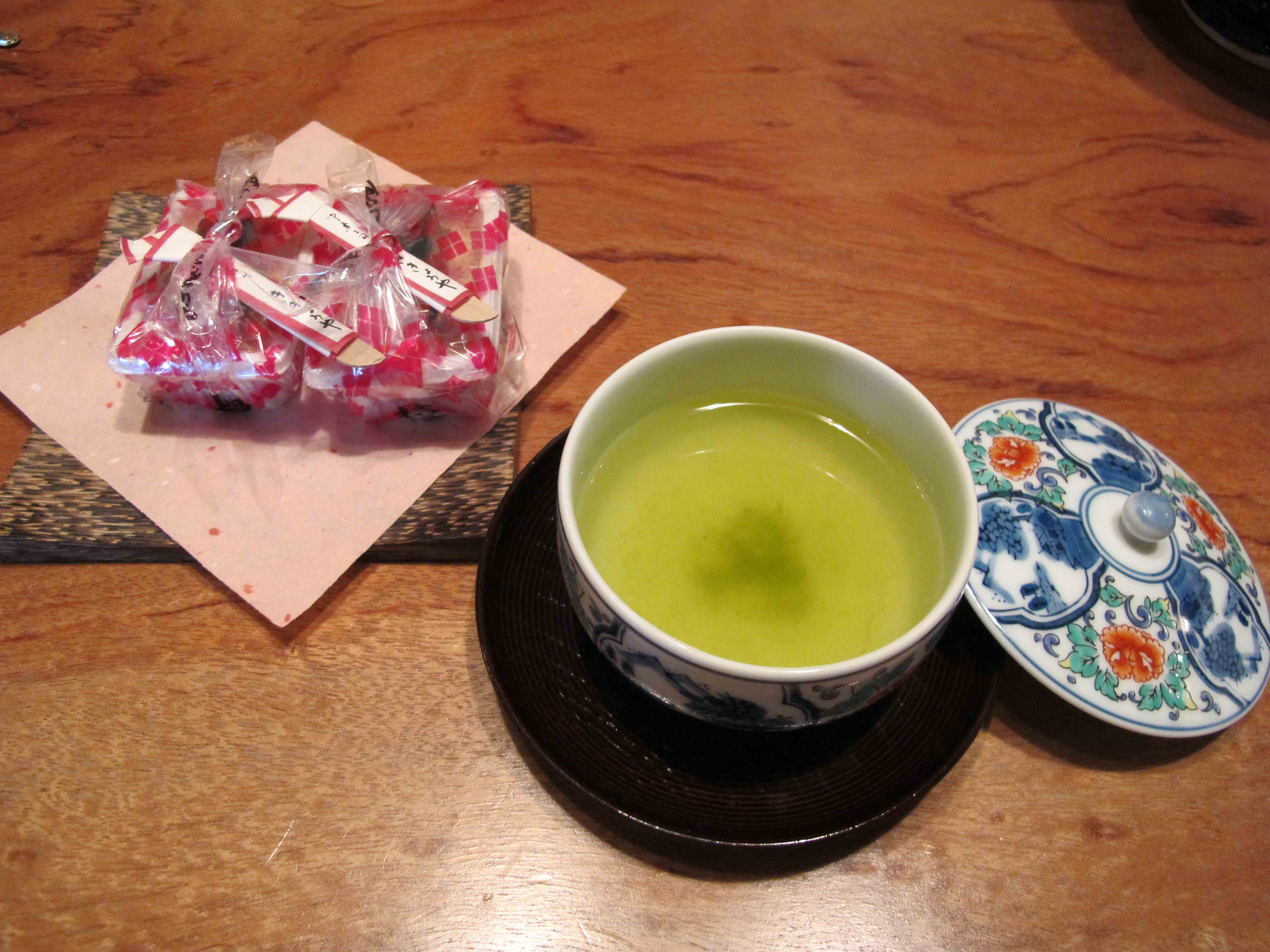 welcome drinkเป็นชาเขียวรสข้าวคั่วกับขนมแป้งนิ่มๆมีน้ำเชื่อมราด