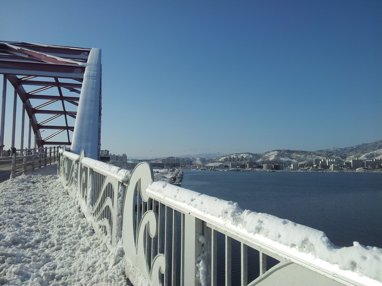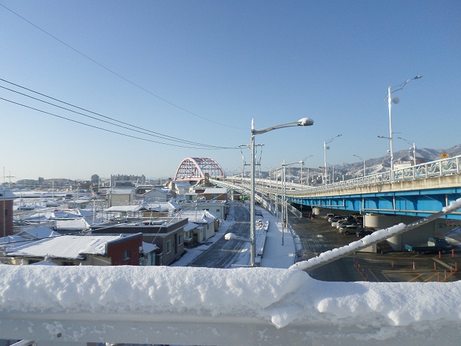 และแล้วก็เดินจนถึงบันได..มองขึ้นไป....คิดในใจตูจะลื่นตกลงมาไหม?เสียวสุดๆกลัวลื่น..บันได้กชั้นแถมบางช่วงเป็นน้ำแข็งด้วย...เราก็พยายามเดินทางที่ไม่มีน้ำแข็งและก็จับราวบันไดไว้ดีๆ...แต่เจ้าราวบันไดก็มีหิมะเกาะอยู่เราก็ไม่ได้ใส่ถุงมือไปด้วย....กว่าจะถึงข้างบนมือชาไปเลย..แต่คุ้มมากเห็นเมืองเกือบทั้งเมือง...ยิ่งเราเดินลอดใต้สะพานเพื่อมาเดินกลับอีกฝั่งจะเห็นทิวเขาที่เราไปขึ้นมาเมื่อวานเป็นฉากหลังของเมืองด้วย..เหมือนภาพถ่ายจากนิตยสารท่องเที่ยวเลย...สวยจริงๆ..ถ้าเราไม่เจอหิมะตกก็ไม่รู้จะเจอภาพสวยๆอย่างนี้หรือป่าว...เราใช่เวลาอยู่ตรงนั้นพักใหญ่ๆ.