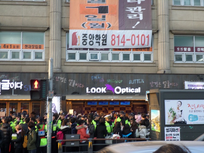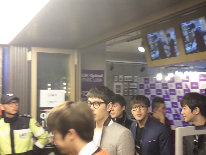 เมื่อเราออกมาจากสถานีกันแล้วก็เดินหาร้านแว่นตาที่จัดงาน..ตอนแรกเราเดินข้ามฝั่งไปเลยทางมันเชื่อมกันออกมาจากสถานี..แต่เราเอะใจว่าเหมือนจะไม่ใช่เลยหยุดอยู่บนสะพานแล้วมองออกไปสองฝั่งเห็นคนเยอะอยู่หน้าร้านร้านหนึ่ง.ซึ่งเราก็ไม่รู้ว่าคือร้านอะไร...แต่รู้สึกว่าต้องไปตรงนั้น...เราก็เดินย้อนกลับมาทางเดิมก็จะขึ้นสะพาน. เราต้องรีบแล้วเพราะงานเริ่มหกโมงเย็นเราออกจากสถานีก๋หกโมงแล้ว...เราก็รีบไปตรงจุดนั้น..คนเยอะมากเดินผ่านไปแทบไม่ได้แต่เราเห็นโปสเตอร์2pmแล้ว..เย่ๆ. ถึงจนได้แต่คนเยอะมาก ตำรวจเกือบสามสิบนายต้องมาตั้งกำแพงมนุษย์เพื่อกั้นคน...เราก็ยื่นสังเกตุการ์ณอยู่พักใหญ่คงยังไม่มา...แต่เราโดนบังมิดเลย..เราต้องเก็บรูปไปฝากเพื่อนเราให้ได้....และแล้ว2pmก็มา...กรี๊ดดดดดดดดไม่ทัน555มองไม่เห็นเห็นแต่รถ555