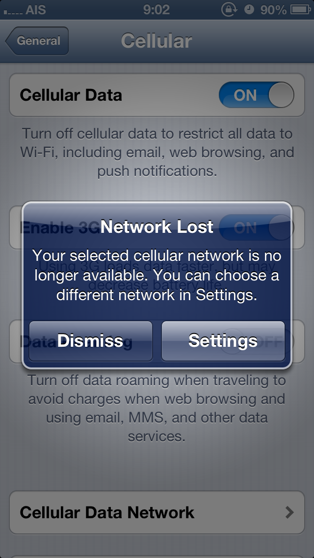 ประมาณ 1 ปี ที่เปิด-ปิด 3G ใน iPhone แล้วชื่อเครือข่ายเปลี่ยนระหว่าง AIS (2100 MHz) กับ TH GSM (900 MHz) ข้างบนจอ ผมใช้มาหลายเครือข่ายในประเทศและต่างประเทศแต่ผมก็ไม่เคยเจออะไรแบบนี้มาก่อน ยกเว้น TRUE