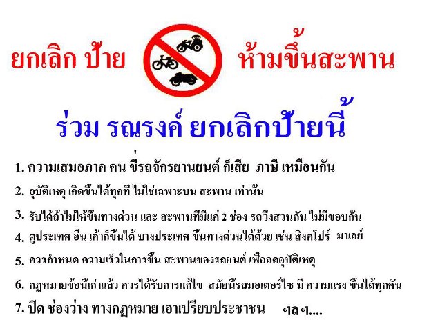 จำได้ว่าเคยมีประเด็นอยู่ แล้วผมไม่ได้ตามต่อว่าเป็นไงบ้าง เพราะที่เจอทุกวันนี้ก็คือเห็นขี่ขึ้นกันเป็นปกติ และก็ไม่มีป้ายห้ามขึ้นเลย (เฉพาะแยกที่ผมผ่านประจำนะครับ ที่อื่นไม่ทราบเหมือนกัน) มอเตอร์ไซค์พ
