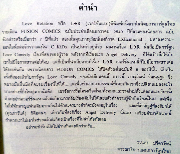 มาแล้วครับ การ์ฺตูนที่ สนพ.หนึ่งอวยมากที่สุดในเดือนนี้เลย นั่นก็คือเรื่องแอลมากกว่าอาร์ ...เอ้ย! Love Rotation(รักเอยจนหมุนไป*) นั่นเองครับ เกี่ยวกับที่มาของเรื่องนี้ อ่านคำนำในเล่มเลยจะเข้าใจเร็วกว่าเนอะ เอาล่ะ ลืมเรื่องที่ผมดองไม่ยอมรีวิวซะทีแล้วลัดคิวมาดูรายละเอียดกันเลยดีกว่า ราคาปก : 65฿ จำนวนหน้า : 192 หน้า กระดาษ : ถนอมสายตายี่ห้อขาใหญ่วงการ หน้าสีในเล่ม : 1 แผ่้น 2 หน้า อันนี้เป็นตัวอย่างสุดอวยของทาง สนพ. เอง http://www.facebook.com/photo.php?fbid=508614889201108 http://www.facebook.com/photo.php?fbid=538130306249581 http://www.facebook.com/photo.php?fbid=520372878025309 http://www.facebook.com/media/set/?set=a.519687421427188.1073741868.193409380721662 http://www.facebook.com/media/set/?set=a.519791608083436.1073741869.193409380721662 เยอะจริงๆ ...แต่ยังน้อยกว่าหอยนะ(?) ต่อไปเป็นรีวิวจากทางผมนะครับ ปกนอกดูจนเอียนแล้ว แกะดูปกนอกเลยละกัน ได้มาตราฐานการ์ตูนไทย...คือส่วนใหญ่ไม่มีมุขด้านในเน้อ หน้าสีด้านใน ใช้กระดาษเดียวกับที่พิมพ์ขาวดำนั่นแหละ รู้สึกบางมองทะลุนิดๆ ปกหลังและเรื่องย่อ ข้อความจากคนวาด.... เรื่องตัวอย่างด้านใน ลงแค่รูป AVATAR คนวาดทีมาแจมในเรื่องละกัน (เดียวสปอยมุขหมด) เนื่องจากผมไม่มีฉบับแรกเริ่มที่ตีพิมพ์ในนิตยสารฟิวชั่น ก็เลยวิจารณ์เรื่องความแตกต่างไม่ได้ (ตอนนั้นกะรอซื้อรวมเล่ม...อืม คนคิดเหมือนกันเยอะสินะ เลยเจ๊งเลย) โดยรวมก็...ทำไมรู้สึกวาดเนี้ยบกว่า EXE อีก(วะ!) ยิ่งฉากสาวๆโผล่้(ยกเว้นเพื่อนพระเอก) ทุกนางสวยนิ้ง(ยกเว้นเพื่อนพระเอก) แถมดีไซน์ชุดได้โดดเด่นแบบภายในปีนี้คุณเจอคนคอสแน่ๆ (ยกเว้นเพื่อนพระเอก จะย้ำทำไมเนี่ย) ทว่าเรื่องการลำดับภาพ คิดว่ายังสะดุดอยู่บ้าง ไม่ไหลลื่นเท่าไร ฉากเปิดตอนจู่ๆก็โผล่มาทำให้เรื่องสะดุดด้วยซ้ำ มุขก็น้อยกว่า EXE ค่อนข้างเยอะ พอเดาได้ด้วยว่าจะมาไม้ไหน แต่ยอมรับเลย มุขฉากต่อสู้เนี่ย เดาไม่ออกจริงๆ ...ไม่สิ ไม่นึกว่าจะกล้าเล่นมุขนี้ต่างหาก ส่วนตัวคงหวังว่าเยอะไปหน่อย แต่ก็ยังน่าอ่านครับ โดยเฉพาะเด็กโข่งที่ทันอ่าน Angel Delivery และยังเจ็บใจที่ สนพ. นั้นเจ๊งจนไม่ได้อ่านตอนจบ เลิกหวังอ่านตอนจบเรื่องนั้นแล้วมาลุ้นให้เรื่องนี้ออกจนจบดีกว่าเน้อ (SIC คงไม่เจ๊งภายใน 50 ปีนี้หรอกน่า=ฮา) หมายเหตุ* : ชื่อแปลไทย จขกท.ตั้งมั่วซั่วเอง ไม่ใช่ชื่อทางการเน้อ จะแปลตรงๆว่าวงเวียนหัวใจก็...ค้นด้วยอากู๋ดูละกัน ว่าแต่ต้องกดโค้ทอะไรถึงจะได้ลูกศรขวาเนี้ย! สรุปคะแนน 3.5 ดาว ผิดหวังหน่อยๆเพราะบั่นทอนปัญญาน้อยกว่าที่คิด ดีที่มีหนุ่มแว่นด้วย ฮิ้ว~