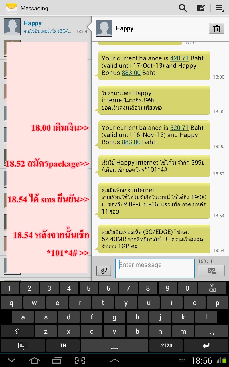 เราใช้ Dtac package399 ซึ่งทันจะหมดอายุวันที่ 9พค56 เวลา17.50 ซึ่งพอหมดแพกเกจมันก็ต่ออายุไม่ได้เพราะเงินไม่พอ เรามาเติมทีหลังตอนหกโมงเย็น แล้วสมัครแพกเกจ399ใหม่ พอระบบส่งsmsยืนยันมาว่าใช้ได้ เราก็เช็กปริมาณใช้งานทันที *101*4# สักสามสี่นาทีระบบก็ส่่งข้อความมาว่าเราใช้ไปแล้ว 52Mbs ทั้งที่เราเพิ่งสมัครยังไม่ถึงห้านาทีเลย ยังไม่เปิด mobile data ด้วยซ้ำ