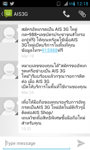 "เพื่อให้มือถือของคุณรองรับการอัพเกรดเป็น AIS 3G ใหม่อัตโนมัติเร็วๆนี้ ติดต่อ AIS Shop/เทเลวิซเพื่อรับสิทธิพิเศษซื้อมือถือใหม่สำหรับคุณ"