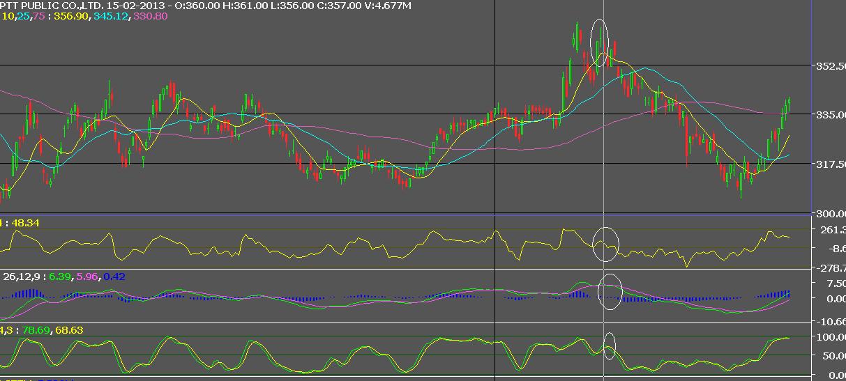 ขาขึ้น และยังมีราคายืนเหนือเส้นค่าเฉลี่ย 10, 25, 75 แต่พอเขาเข้าซื้อปุ๊บ หลังจากปิดตลาด เกิดโดจิ (กากบาท) เขาดูกราฟที่เกิดขึ้นแล้วตีความว่า มัน "อาจเป็น "Morning Star'' อีกทั้งราคาปิดยืนเหนือราคาของเมื่อวาน แม้ว่าจะไม่สูงมากนัก และดูจาก การยืนเหนือเส้นค่าเฉลี่ยทั้ง 3 เส้นแล้ว มันน่าจะไปต่อได้ เลยถือไว้ พออีกวันต่อมามันก็ลงทันที และเกิดเป็นรูปแบบของ Evening Star ที่ชัดเจน (3 แท่ง) และหลังจากนั้นราคาก็ ลง ลง ลง ยาวเป็นเดือน เขาถามว่าจะรู้ได้อย่างไรว่ามันเป็น Evening Star จริงๆ จะได้ขายได้ทัน ไม่อยากติดดอยนานๆ ผมก็บอกว่า จริงๆ เราไม่รู้ 100 % หรอกว่ามันจะลง ถ้ารู้ 100 % ผมก็รวยเป็นเศรษฐีมีเงินไปซื้อกิจการ Makro แล้วครับ