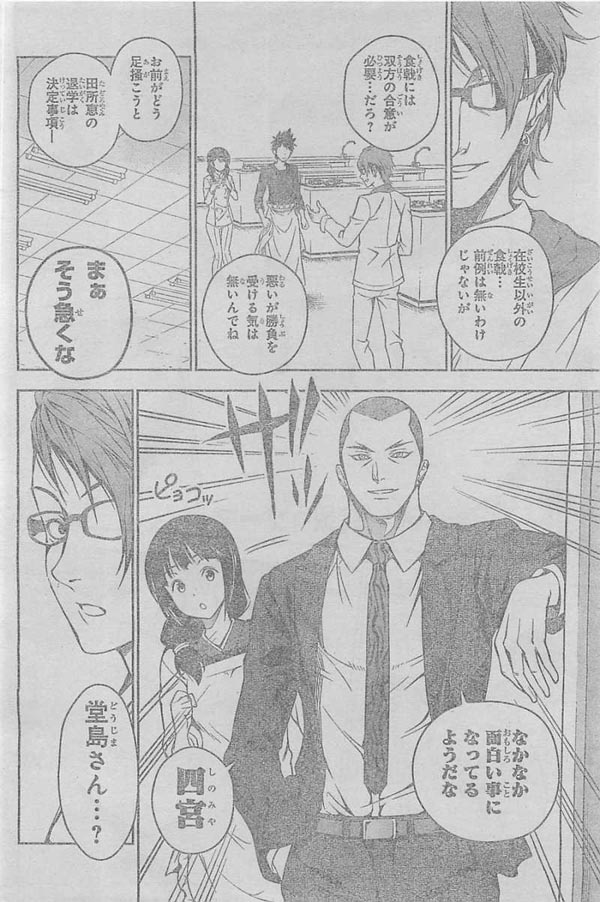 -โคจิโร่เห็นแบบนั้นเลยตอบไปว่า งั้นก็โอเค เขาจะทำตามความต้องการของโดจิม่า ถ้าโซมะชนะเขาได้เขาจะเปลี่ยนผลการตัดสินของเมงุมิ แต่ถ้าแพ้เขาจะไล่ทั้งคู่ออกไปซะ ก่อนจะเดินออกจากห้องไป ส่วนโดจิม่าก็นัดให้พวกโซมะมาที่อาคารแยกหลังทำบททดสอบตอนบ่ายเสร็จ