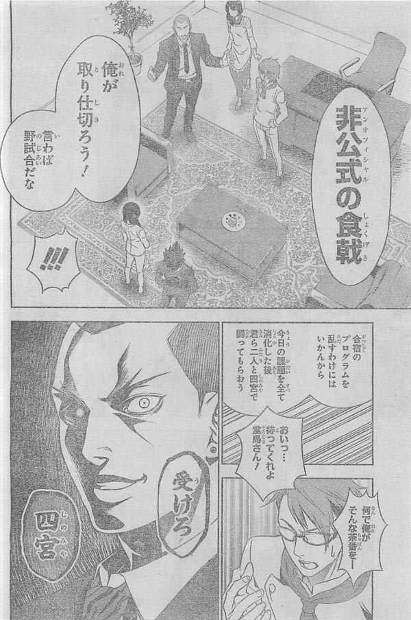 -โดนาโต้(คนหน้าฝรั่ง)เอ่ยออกมาว่าน่าแปลกใจเหมือนกันที่มีการแข่งโชคุเงคิแบบไม่เป็นทางการเกิดขึ้นในค่ายฝึกฝนแถมยังเป็นการแข่งระหว่างศิษย์เก่าปะทะกับนักเรียนที่เรียนอยู่อีกด้วย ถ้าอาจารย์แชปเพลนรู้เข้าล่ะก็จะเป็นยังไงนะ ชายผมดำที่ชื่อฮิโตชิ(ที่เป็นคนควบคุมบรรดานักเรียนให้ทำอาหารเสิร์ฟบรรดานักกล้ามในสองคอนที่แล้ว)ก็บอกว่า ไม่เห็นต้องถามเลยแกโกรธอยู่แล้วแน่ๆล่ะ ส่วนฟุยุมิ(เชฟอาหารหญิงอิตาเลี่ยน)ก็เอ่ยออกมาบอกว่า ถ้าเกิดอาจารย์รู้เข้าล่ะก็ เธอก็จะรีบเผ่นแล้วป้ายความผิดให้โคจิโร่แทน ซึ่งโคจิโร่ก็ตะโกนกลับมาว่าฉันได้ยินนะฟุยุมิ (มาดเก็กๆหายหมด) ว่าแล้วโดจิม่าก็เริ่มอธิบายการแข่งขัน นี้เป็นการแข่งขัน2ต่อ1 ระหว่างโซมะ&เมงุมิปะทะโคจิโร่