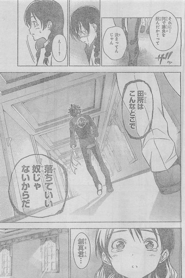 -"เธอพูดสำเนียงถิ่นออกมาล่ะ" ว่าแล้วเมงุมิก็ถึงกับตกใจพร้อมกับเอ่ยออกมาทันทีว่า นั้นมันไม่ใช่เรื่องที่ควรจะสนใจตอนนี้นะ! (สำหรับคนไม่เข้าใจ หน้าที่แล้วเมงุมิโกรธโซมะจนพูดสำเนียงบ้านเกิดของเธอออกมา) ก่อนโซมะจะเดินเข้ามาจูงมือให้เมงุมิลุกขึ้นยืนพร้อมกับเอ่ยว่า เดี้ยวเราจะไปเข้าบททดสอบตอนบ่ายสายนะ เมงุมิที่ค่อยๆลุกขึ้นเลยพูดออกไปว่า ใครๆรวมถึงโซมะเองก็คอยช่วยเหลือเธอมาตลอด แต่สุดท้ายเธอก็ต้องมาเจอเรื่องแบบนี้ เธอทำให้โซมะต้องมาลำบากไปด้วย ตอนนี้เธอรู้สึกว่าต่อให้ขอโทษแค่ไหนกับโซมะก็คงไม่พอหรอก แต่โซมะก็เอ่ยออกไปว่าอย่าไปคิดมากน่า เพราะเขาเป็นคนตัดสินใจเรื่องการท้าแข่งนี้ด้วยตัวเอง