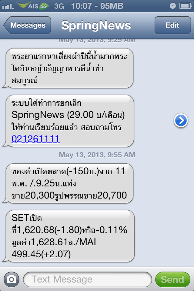 ผมไม่เคยสมัคร แถมใน E-Service ผมก็ไม่เปิดรับ SMS โฆษณาอะไรเลย ช่วยดูหน่อยว่าเค้าส่งมาทางไหน แถมมั่วอีกต่างหาก ส่ง SMS มาบอกว่ายกเลิกบริการแล้ว แต่หลังจากนั้นอีกไม่ถึงชั่วโมงส่งข่าวมาอีกซะงั้น