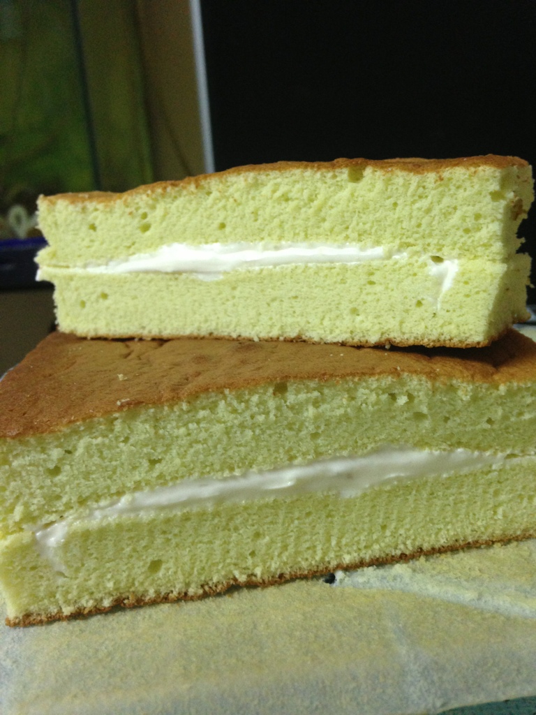 พอดีว่าลองทำโรลเค้กครีมสด ตัวเค้ก: เป็นเนื้อชิฟฟ่อน แต่พอทำเสร็จ เหมือนตัวแป้งไม่ฟูไม่นุ่ม แบนๆ พอเก็บแช่ตู้เย็นกลายเป็นแข็งเลยค่ะ ส่วนไส้: ตีวิปครีมแบบnon dairy (เค้าบอกไม่จำเป็นต้องตีใส่ภาชนะแช่เย็