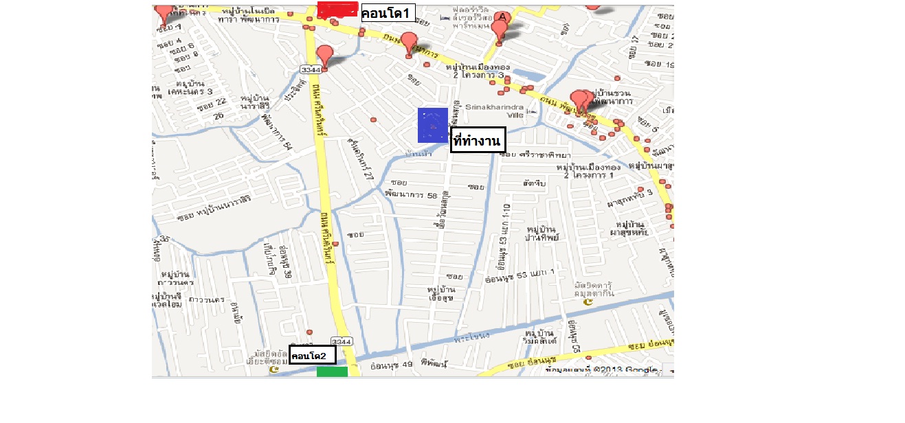 2. คอนโด 2(สี่เหลี่ยมสีเขียว) เป็นคอนโดสร้างเสร็จน่าจะปี2009อยู่บริเวณศรีนครินทร์ตัดอ่อนนุช ข้างตลาดเอี่ยมติดถศรีนครินทร์ ได้ห้อง39 ตรม แถมเฟอร์ เครื่องใช้ไฟฟ้า ชั้น2 ราคา 1.45 ล การเดินทางมาที่ทำงาน อาศัยรถสองแถวสลับกับแท็กซี่ ทั้งไปและกลับ