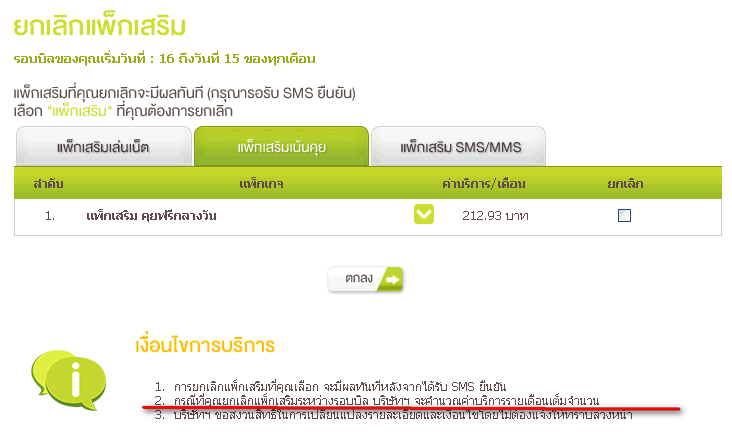 ช่วงนี้ผมใช้น้อยลง จึงต้องการยกเลิกแพ็คเสริมคุยฟรีกลางวัน แต่การยกเลิกแพ็คเสริมระหว่างรอบบิล จะเสียค่าบริการเต็มเดือน