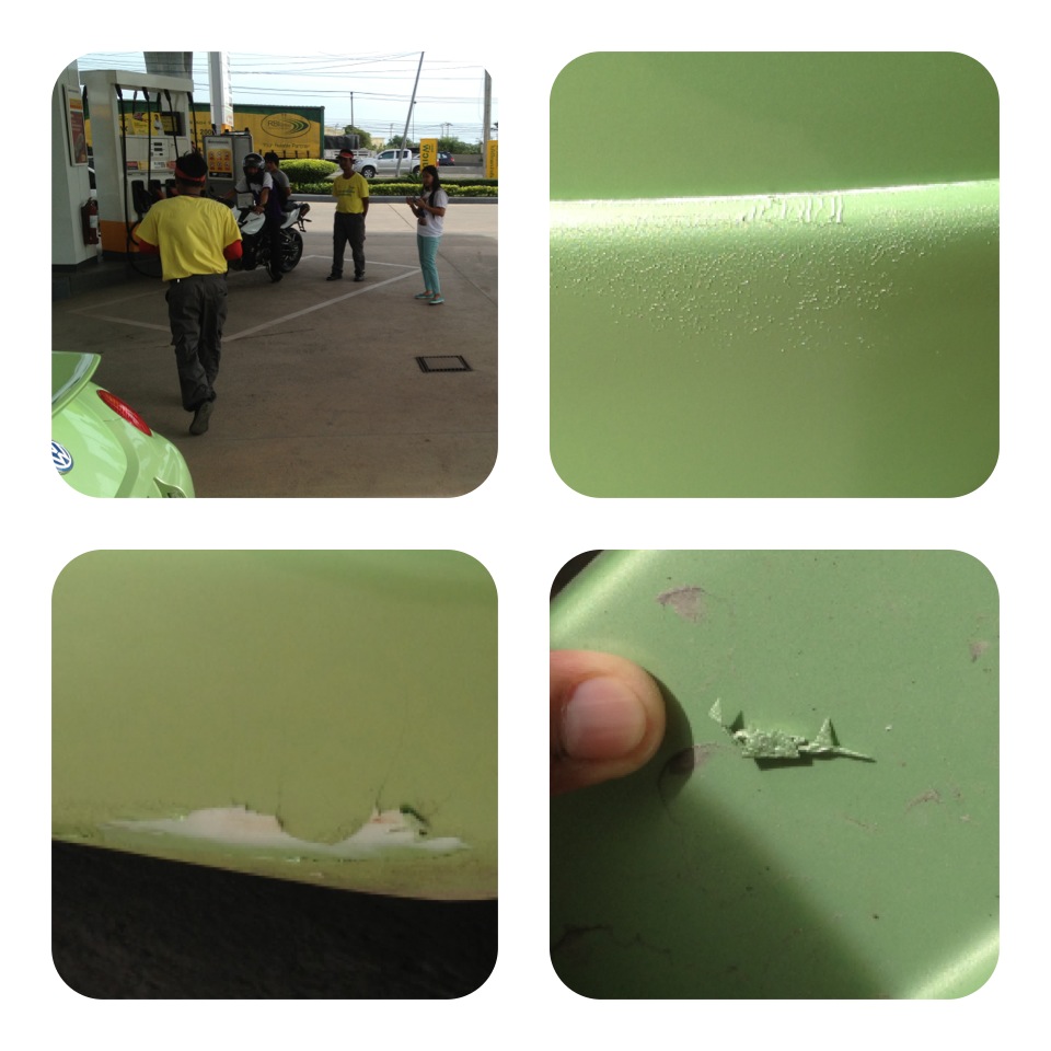 ขณะนั่นผมสังเกตเห็นสีที่บริเวณชุดแต่งไฟเบอร์บริเวณกันชนท้ายเริ่มมีลักษณะการพองตัวของสีเกิดขึ้น ประกอบกับยางที่ใช้รีดน้ำไปถูทำให้สีเกิดการลอกออกอย่างเห็นได้ชัด ซึ่งผมไม่คิดว่าเหตุการณ์นี้จะเกิดขึ้น จึงถามเด็กปั้มว่า "น้องเห็นอะไรไหม สีรถพี่ลอก แล้วจะทำยังไง ใครจะรับผิดชอบ" ผมจึงเดินไปที่ Counter ชำระเงินแล้วถามว่า "น้ำมันกัดสีรถผมลอกใครจะรับผิดชอบ ผมขอพบผู้จัดการ" จากนั้นพนักงานจึงได้ติดต่อไปยังผู้จัดการเล่าถึงเหตุการณ์ที่เกิดขึ้น ผู้จัดการแจ้งให้พนักงานเก็บเงินค่าน้ำมันผมก่อน ส่วนเขากำลังเข้ามา ผมได้ยินดังนั้นก็เลยถามว่าค่าน้ำมันเท่าไร พนักงานแจ้งว่า 2,7XX (73 ลิตร) บาท ผมเลยบอกว่าปกติผมเติมเต็มถังไม่ถึง 2,000 บาท ทำไมผมต้องรับผิดชอบน้ำมันที่ล้นออกมาด้วย ผมไม่จ่าย รอผู้จัดการมาคุย