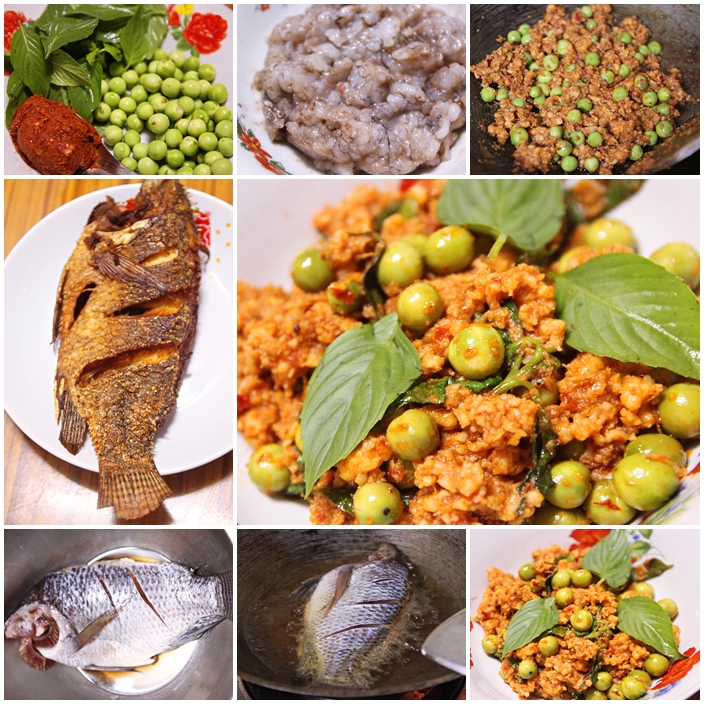 ผัดพริกแกงกุ้งสับมะเขือพวงกับปลานิลทอด กุ้งแช่แข็งไว้ในตู้เย็นจนลืม เช็คสภาพแล้วโอเค ยังใช้ได้อยู่