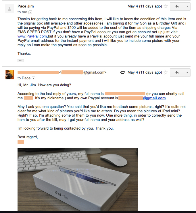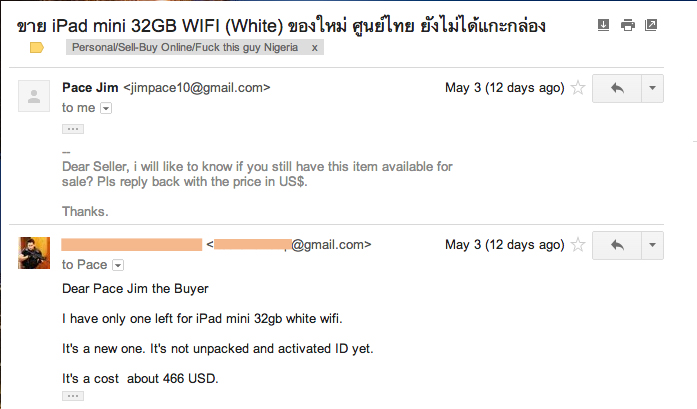 สวัสดีครับพี่น้องชาวพันทิพย์ เมื่อไม่กี่อาทิตที่ผ่านมาผมได้ทำการประกาศขาย iPad Mini ผ่านหลายช่องทางบนตลาดออนไลน์ เมื่อวางขายได้สักพัก ก็มีชาวต่างชาติติดต่อเข้ามาสอบถามราคาสินค้า โดยสอบถามทั่วไปเกี่ยวกับตัวสินค้า และขอทราบราคาเป็น US Dollar ผมก็ตอบแจ้งราคา และลักษณะสินค้ากลับไป