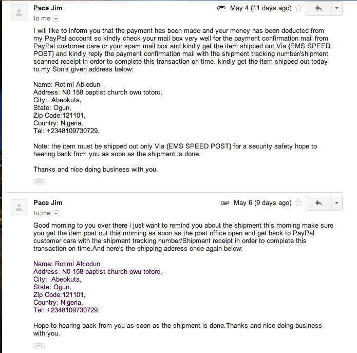 จะเอาอะไรไปได้หว้า) หรือว่าพี่แกพิมพ์ผิดว่าเงินพี่แกเองนั้นและที่โดนหักไปแล้ว(ภาษาพี่แกสื่อสารได้งงมาก) และก็ขอให้ตรวจสอบเมล์จาก PayPal ซึ่งถ้าไม่เจอให้ดูใน Spam Mail***(อีเมล์ทางการ ทำไม่ต้องไปอยู่ใน Spam?) โดยขอให้ผมทำการส่ง EMS ไป แล้วให้เอา Tracking Number (หมายเลขการตรวจสอบการส่งจ่ายทางไปรษณี) ตอบไปกลับใน Email ที่ PayPal ส่งมา พี่แกก็บอกว่ายังไงก็กรุณาส่งให้วันนี้เลยนะครับ จะได้ทันวันเกิดลูกชายของผม (ยอดคุณพ่อมั๊กๆ)