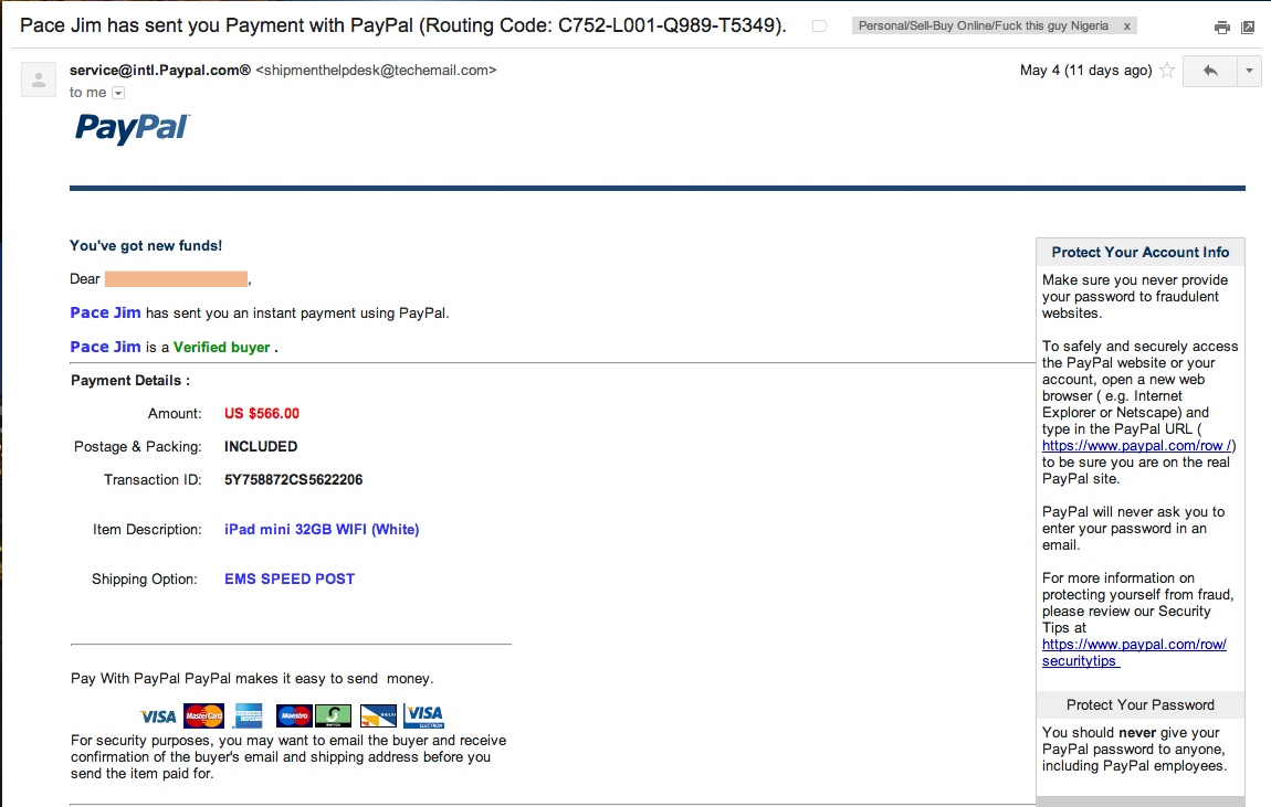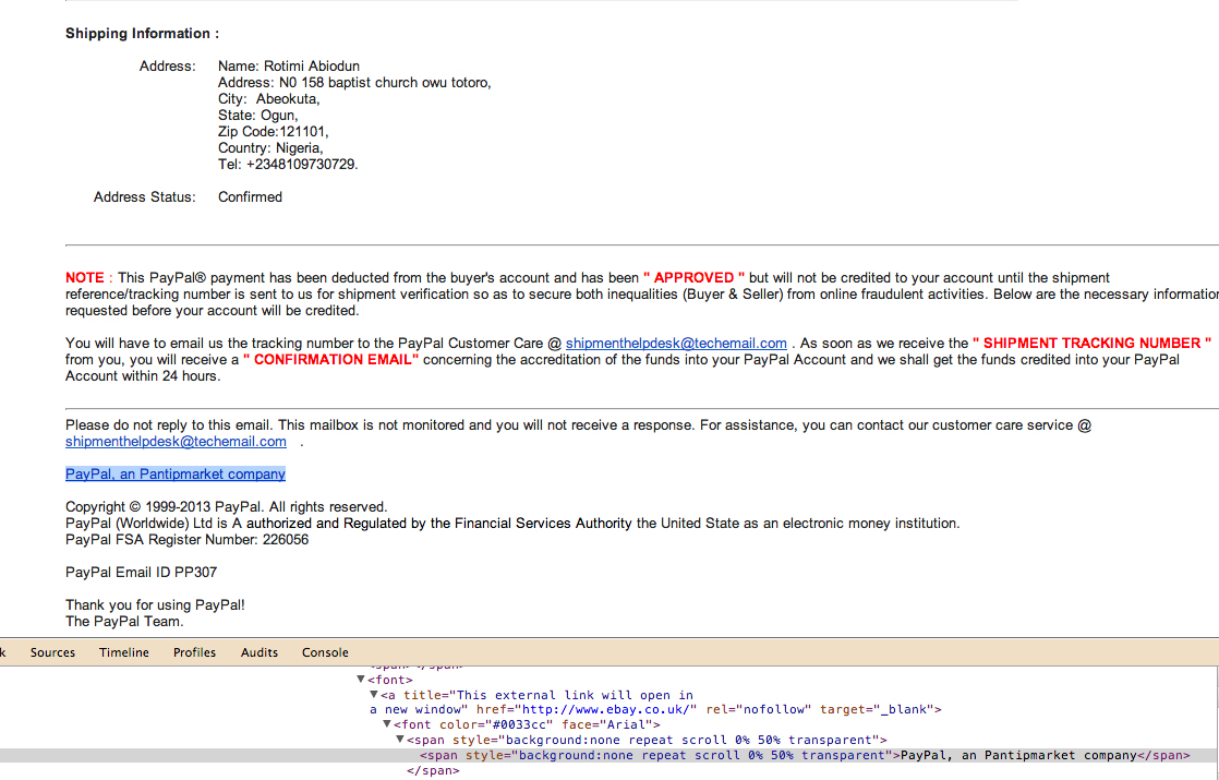 เป็นเมล์ที่มีหน้าตาเป็นทางการมาจาก PayPal ระบุผู้ส่ง จำนวนเงิน หมายเลขส่งของ