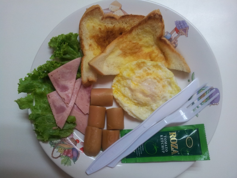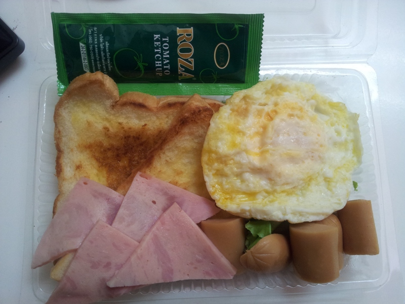 ตอนเช้ามีแผงขายอาหารสำเร็จรูปเยอะแยะหน้าห้างบิ๊กซีลาดพร้าว ราคาไม่ค่อยแพง บางเจ้าก็โอเค บางเจ้าก็ไม่อร่อย ที่เก๋ไก๋มี ABF ขายด้วยในราคาแค่ 25 บ ไข่ดาวเบอร์เล็ก แฮมกับไส้กรอกไม่แป้งด้วยนะ ขนมปังทาเนย 1 แผ่น (ใช้เนยจริงไม่มาการีนซะด้วย) ผักรองแบบพอกินเลยพร้อมมีด ส้อมพลาสติกและซอสมะเขือเทศ เอามาใส่จานแล้วหลอกสามีว่าทำเอง (แต่ไม่มีใครเชื่อ) เพิ่มเครื่องดื่มอีกแก้ว