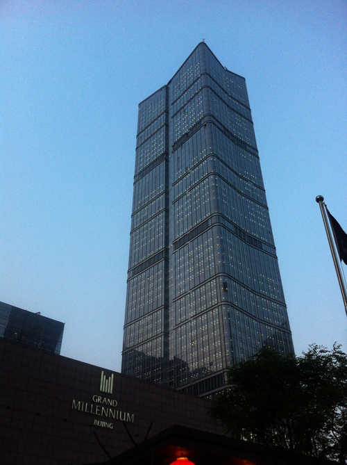 พวกเราต้องเปลี่ยนโรงแรมเพื่อไปใช้ voucher ฟรีที่น้องให้มา ณ Grand Millennium Beijing นั่งแท็กซี่มาประมาณสี่สิบนาที จริงๆ Grand Millennium Beijing เนี่ย อยู่ติดกับสถานีรถไฟฟ้าเลย เพราะทำเลที่ตั้งอยู่บน Business street ของปักกิ่งเลย เยื้องๆกับตึกสถานีโทรทัศน์ที่หน้าตาประหลาดๆ แต่จากประสบการณ์ การลากกระเป๋าขึ้น subway ปักกิ่ง มันคงทุลักทุเลมาก ก็เลยเรียกแท็กซี่ดีกว่า สี่คนก็แชร์ค่ารถกันไป