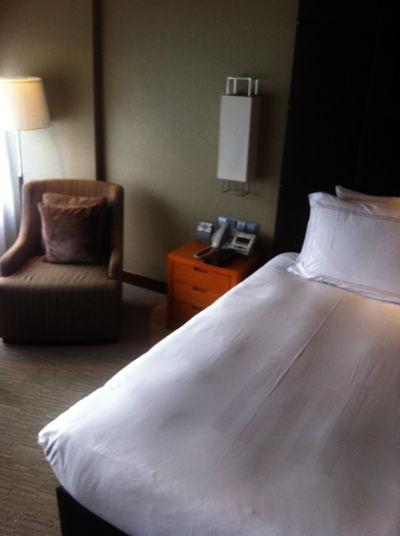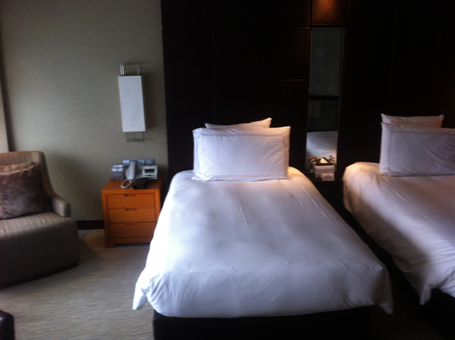 เราได้ห้อง Suite มาซึ่งขอบอกว่า กว้างขวางและสะดวกสบายมาก ก่อนมาส่งข่าวมาบอกทางโรงแรมแล้วว่าขอสองเตียงก็เลยได้เป็นห้องที่ว่า แต่เตียงที่นี่แคบกว่าที่ Holiday Inn อีกนะ ประทับใจห้องมากแต่ First Impression ของผมกับที่นี่ไม่ดีมาก เพราะรอเช็คอินนาน มีพนักงานสองสามคนก็ทำงานอยู่คนเดียว แถมไม่มีการให้ข้อมูลใดๆตอนเช็คอินเลย ผมกับเพื่อนอีกคนยังต้องลากกระเป๋าสี่ใบขึ้นห้องเองแบบไม่มีเบลล์แมนบริการ คือถ้าปรับปรุงตรงจุดนี้ได้จะเยี่ยมมากครับ