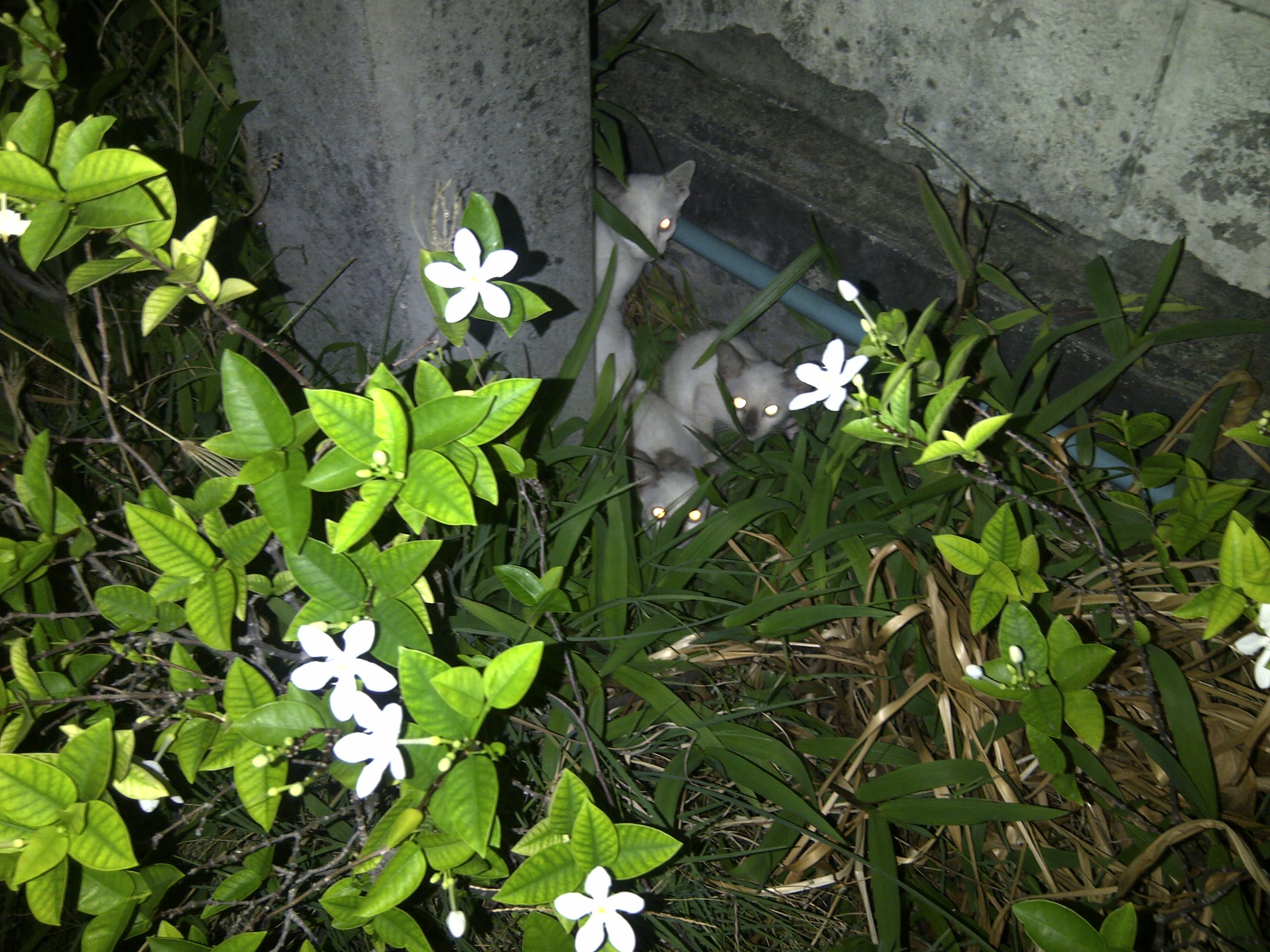 เช้าวันศุกร์ รีบไปธุระแต่แว๊บไปดูตรงพุ่มไม้ ไม่เห็นแล้ว นึกในใจคงอพยพพาครอบครัวไปอยู่ในบ้านนั้นแล้ว ก็สบายใจ แต่กลับบ้านมาตอนค่ำเดินไปดูอีกที อ้าว...ยังอยู่ เหลืออยู่ 2 ตัว สังเกตุึการณ์ตั้งแต่หัวค่ำถึงตอนนี้เทียงคืน ยังไม่เห็นแม่แมว (แต่ก็เอาอาหารเม็ดไปโปรยเล็กน้อย เพราะไ่ม่รู้ว่ามันเล็กไปหรือเปล่า และกลัวมดขึ้น แต่ก็น่าจะรองท้อง และดึกๆ เอาถ้วยน้ำไปวาง ไม่รู้ว่ามันรู้จักถ้วยน้ำไม๊ เห็นเล็งอยู่ไกลๆ)