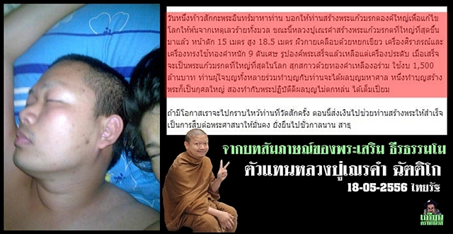 อ่านแล้ว ก็รู้ว่าหลวงปู่กำลังมีโปรเจ็คยักษ์นะครับ กำลังชวนให้ไปทำบุญสร้างพระพุทธรูปราคา พันห้าร้อยล้านอยู่...ก็อ้างว่าเป็นการทำบุญอันแสนใหญ่ยิ่ง นี้บอกว่าท้าวสักกะพระอินทร์ลงมาบอกหลวงปู่ให้สร้างเองเลยนะ ว่าถ้าได้สร้างแล้ว โลกจะพ้นภัย โอ้ว..ก็อดด นี้ติดต่อพระอินทร์ได้ด้วยรึเนี้ยยยย ถึงว่ารู้สึกหลวงปู่จะมีอุปกรณ์สือสารไฮเทคเยอะมากเลย ตกลงจะมาเป็นผู้เผยแพร่คำสอนหรือเป็นตัวแทนเทพ เทวดากันแน่ บผมว่า ถ้าคิดจะทำบุญกันจริงๆน่ะ แค่ให้ข่าวหมากินก็ได้บุญแล้ว ไม่ต้องไปบ้าวัตถุสร้างพระพุทธรูปราคาเป็นพันล้านหรอกมั้ง หรือองค์พระสัมมาสัมพุทธเจ้า ท่านสอนเอาไว้อย่างงั้นเหรอครับ