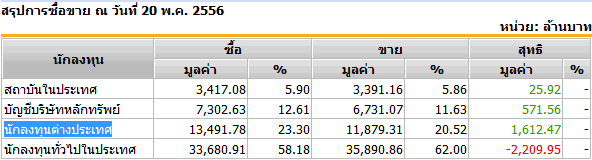 Sinthorn Sumary 20/5/2556 : ต่างชาติซื้อสุทธิ 1,612.47 ลบ.