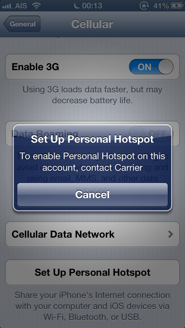 คือผมจะแชร์ 3G จากไอโฟนไปโน๊ตบุ๊ค แต่มันทำไม่ได้อ่ะครับ ตั้งแต่เปลี่ยนมาใช้ ais 3g 2100 เมนู personal hotspot ก้หายไปจากเมนู setting เหลือแต่ในหน้าของเมนู cellular แทน.. พอกดเปิดจากตรงนั้นมันก้แชร์ไม่