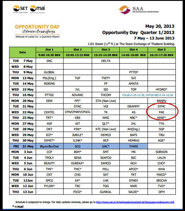 ที่วิ่งเพราะมีที่มา พรุ่งนี้ PAE จะมี opportunity day นะฮะ จะเป็นครั้งแรกในปีนี้ที่คุณรัตนพล (MD) จะมีแถลงถึงแผนธุรกิจปี 56 และที่มาที่ไปของผลกำไรในไตรมาส 1 ที่เติบโตถึง 5 เท่า ใครว่างก็ไปร่วมงานกันได้นะฮะ ที่ตลาดหลักทรัพย์ ตอน 4 โมงเย็นฮะ