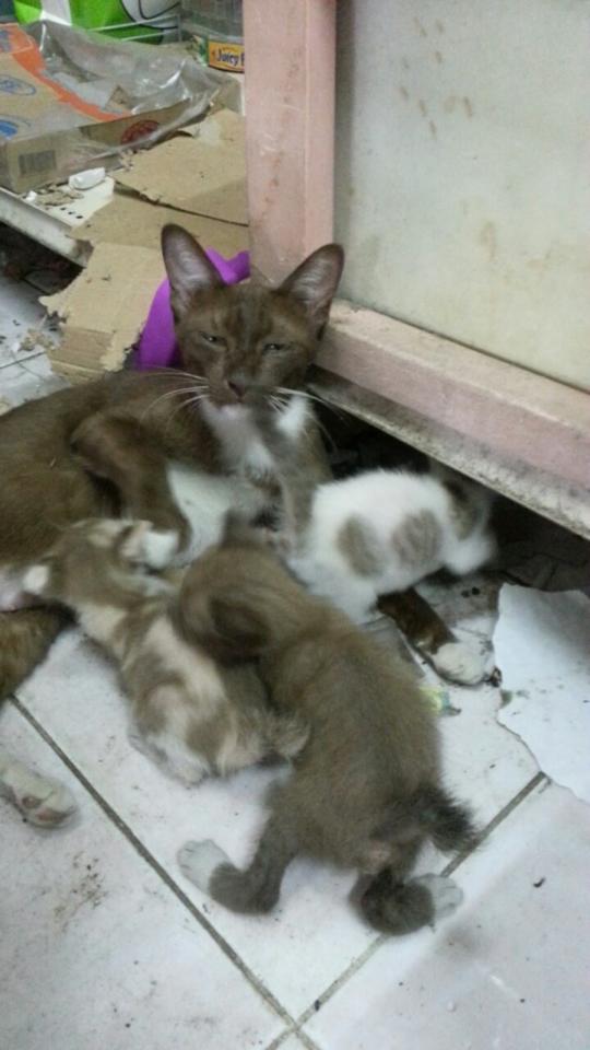 รูปนี้เป็นรูปเมื่อประมาณ 1 เดือนมาแล้ว ตอนนี้เด็กๆแมวอายุประมาณ 2-3 เดือนแล้วค่ะ กำลังซนน่ารัก แม่แมวก็เชื่องขี้อ้อน ทั้งครอบครัวมีผสมศุภลักษณ์หรือวิเชียรมาศมาแน่นอนเพราะสีขาวน้ำตาล หน้าตาดีทุกตัวค่ะ เดิมแม่แมวอาศัยร้านค้าริมถนนย่านพระราม 2 อยู่ พอคลอดลูกก็ไปคลอดและเลี้ยงลูกในร้านค้า เจ้าของร้านไม่รักแมวแต่แรกๆก็ไม่รังเกียจเพราะเด็กๆให้คุณ เค้าถูกหวย เค้าก็เลยยอมเลี้ยง น้องสาวใจดีน้องมิ้งค์ Mink Pilin Pattarapotevong ได้ซื้ออุปกรณ์เลี้ยงแมวเช่นกระบะทราย ทรายแมว อาหารแมวไปให้ด้วย ปรากฎพอเลี้ยงไปได้ประมาณเดือนนึงเจ้าของเกิดบ่นว่าอึแมวเหม็นและลูกแมวกำลังซนชอบไปจับหนูมาเล่น เค้าหาว่าสกปรก และจะไม่เลี้ยงแล้ว เลยงานเข้าต้องรีบมาหาบ้านอุปถัมภ์ด่วน จะรับชั่วคราวหรือถาวรก็ได้ ขอให้เด็กๆได้มีที่อยู่ ไม่ไปเสี่ยงตายโดยปล่อย โดนรถชน โดนหมากัดก็พอ