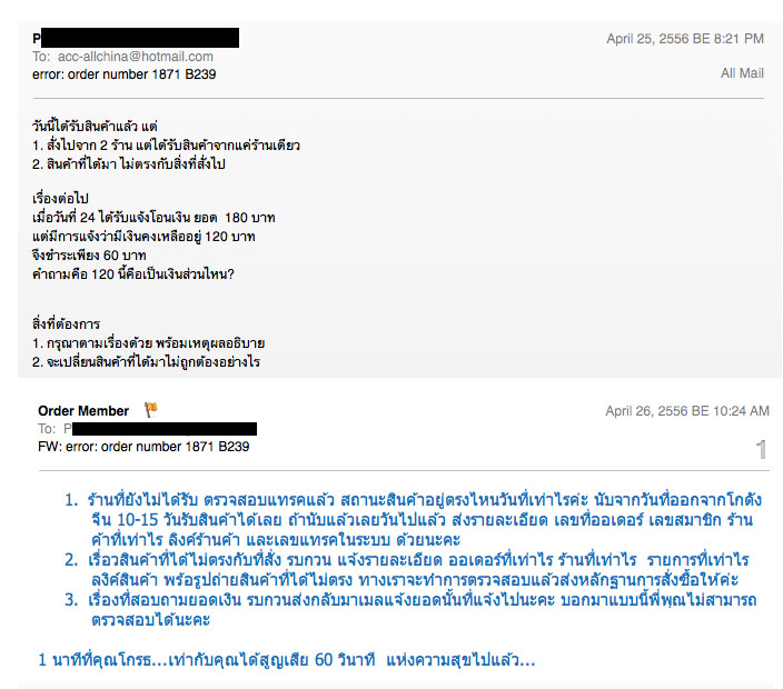 ของ LOT ได้ตั้งแต่เดือนเดือนกุมภาที่ผ่านมา เพราะของต้องใช้เวลาในการขนส่ง โดยของได้รับเดือนประมาณเดือนมีนา ดิฉันสั่งของจาก taobao 3 ร้านภายในหนี่งออเดอร์ ของ lot แรกผ่านไปโดยไม่ดีเท่าทีควร เพราะ ระบบ online แจ้งสถานะสินค้าไม่ทำงาน ทำดิฉันดิฉันไม่เป็นกังวลมาก เพราะของไม่ส่งถึงประเทศไทยสักที และดิฉันได้รับของมาไม่ครบจาก 2 ใน 3 ร้าน โดยแจ้งไปทางบริษัท บริษัทก็บอกให้ทำใบ refund มา หลังจากที่ส่งใบไป ใช่แล้วค่ะ มันหายเงียบได้ ดิฉันก็ชั่งมัน ของมันเล็กๆน้อยๆ