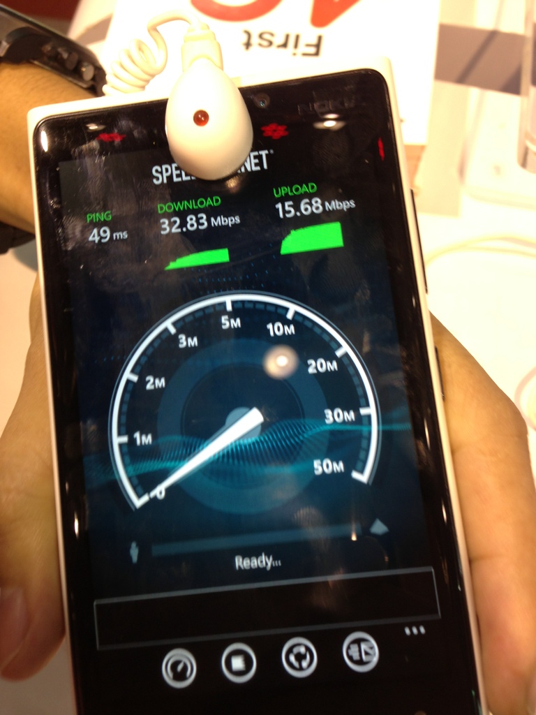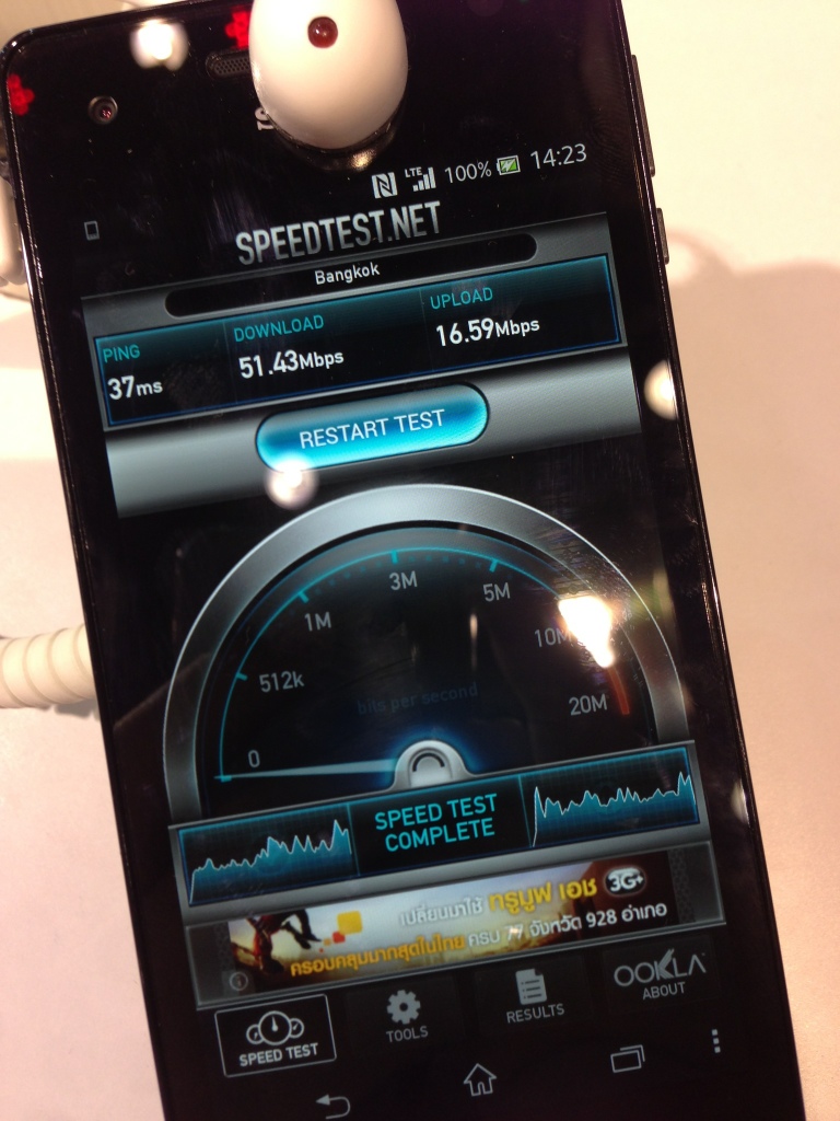 เอา Speed test จาก TRUE H 52004 LTE มาฝากครับ ทดสอบเมื่อวาน เวลา 20.20 ที่ MBK ชั้น 4 โซนโตคิว เครื่อง SONY รุ่น XPERIA V SIM : TRUEMOVE H RealMOVE Package iNET7GB 1199 MainPro สัญญาน : LTE 5200