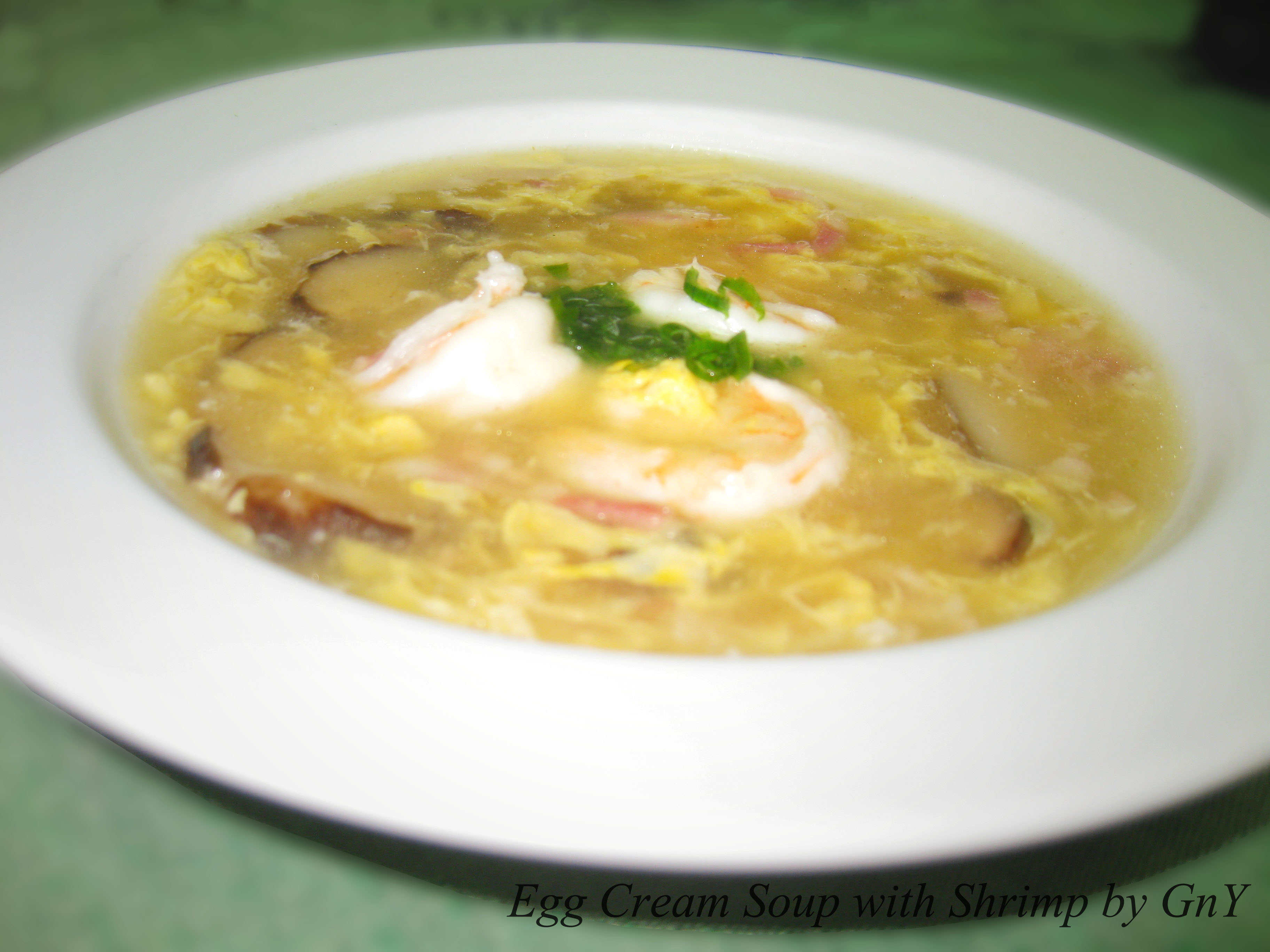 เมนูแรกที่ทำคือ ซุปไข่แบบจีนใส่กุ้ง (Egg Cream Soup with Shrimp in Chinese Style)