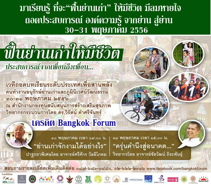 Copy//ภาคีอนุรักษ์ย่านเก่าและภูมินิเวศน์วัฒนธรรม จัดให้มีการสัมมนาถอดบทเรียน "ฟื้นย่านเก่าให้มีชีวิต: ประสบการณ์จากเพื่อนถึงเพื่อน" ในวันที่ ๓๐-๓๑ พฤษภาคม ๒๕๕๖ นี้ ณ สำนักงานกองทุนสนับสนุนการสร้างเสริมสุขภาพ (สสส.) ซอยงามดูพลี ถนนพระราม ๔ เขตสาทร กทม.