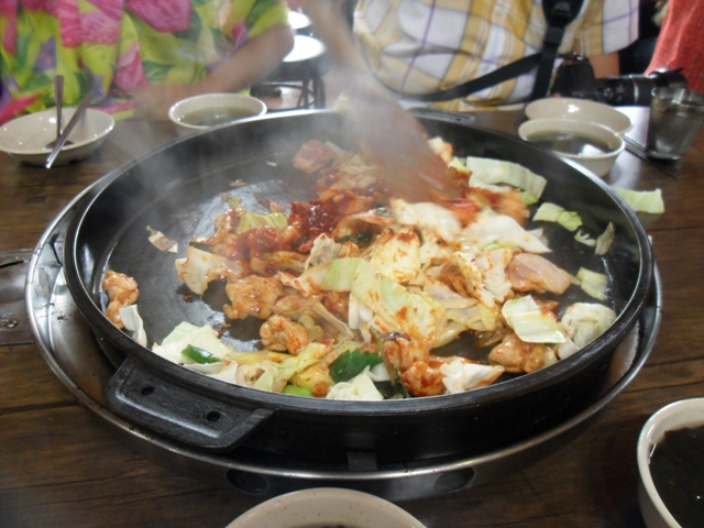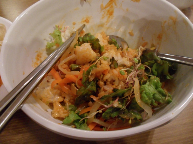 ข้าวยำเกาหลี บิบิมบับ ไม่ได้ใส่หม้อดินร้อนเหมือนบ้านเรา เป็นแค่ผักคลุกข้าวราดด้วยซอสเผ็ดกับเต้าเจี้ยว และก็มีอาหารอื่นๆให้ตักได้ โดยส่วนตัวไม่ค่อยชอบข้าวยำเกาหลีอยู่แล้ว แต่มาถึงเกาหลีแล้วก็ต้องลองตักกินทุกอย่าง อย่างละหน่อยพอให้รู้เท่านั้นก็พอ (ไกด์บอกว่าอย่ากินทิ้งกินขว้างเพราะที่เกาหลีมีเวลาปลูกได้แค่3เดือน ต้องกินให้หมด ชุดนึงกิน4คน ไม่พอเติมได้ แต่เติมแล้วต้องกินให้หมดนะ)