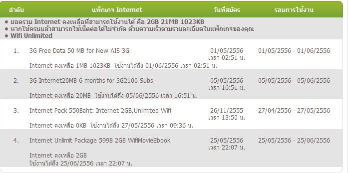 คือปัจจุบันผมใช้ package เสริม 550฿ 3G 2GB แล้วกำลังจะหมดอายุพรุ่งนี้ครับ (27/05/56) และเมื่อคืน (25/05/56) ผมก็ได้สมัคร package 599฿ 3G Unlimit ใช้ความเร็วสูงสุด 2GB พอเช็คใน e-service ยังมีโปรตัวเดิมรวมกับโปรตัวใหม่อยู่ตามรูปครับ คำถามคือผมต้องยกเลิก package 550฿ ก่อนรึเปล่าครับ หรือปล่อยไว้เฉย ๆ เดี๋ยวมันก็ยกเลิกเอง