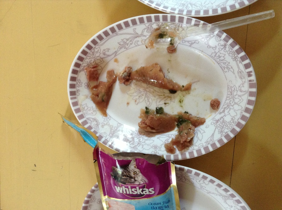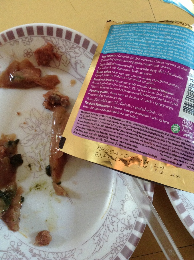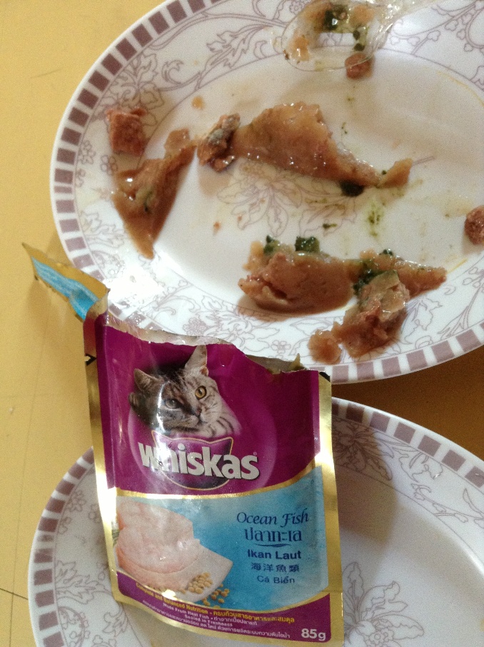 อาหารแมวซองสีม่วง รสปลาทะเล ซื้อจากร้านเพ็ทช็อปที่เชียงใหม่ช่วงสงกรานต์ค่ะ พาเด็ก ๆ กลับบ้านก็เลยแวะซื้อจากร้านใกล้ ๆ บ้าน จำนวน 2 โหล พร้อมกับชาร์กูเมร์ สลับกัน แล้วเหลือก็เก็บกลับมาให้ต่อที่กรุงเทพ สลับกับอาหารกระป๋องเปลือย