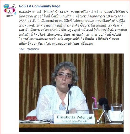 น้องสาวของนายฟาบิโอ กล่าวว่า เมื่อ2 เดือนที่แล้วนายอภิสิทธิ์ ได้ติดต่อ.........พอตอนหลัง เจอมาร์คตอบกลับว่า ไม่ว่าง!!!