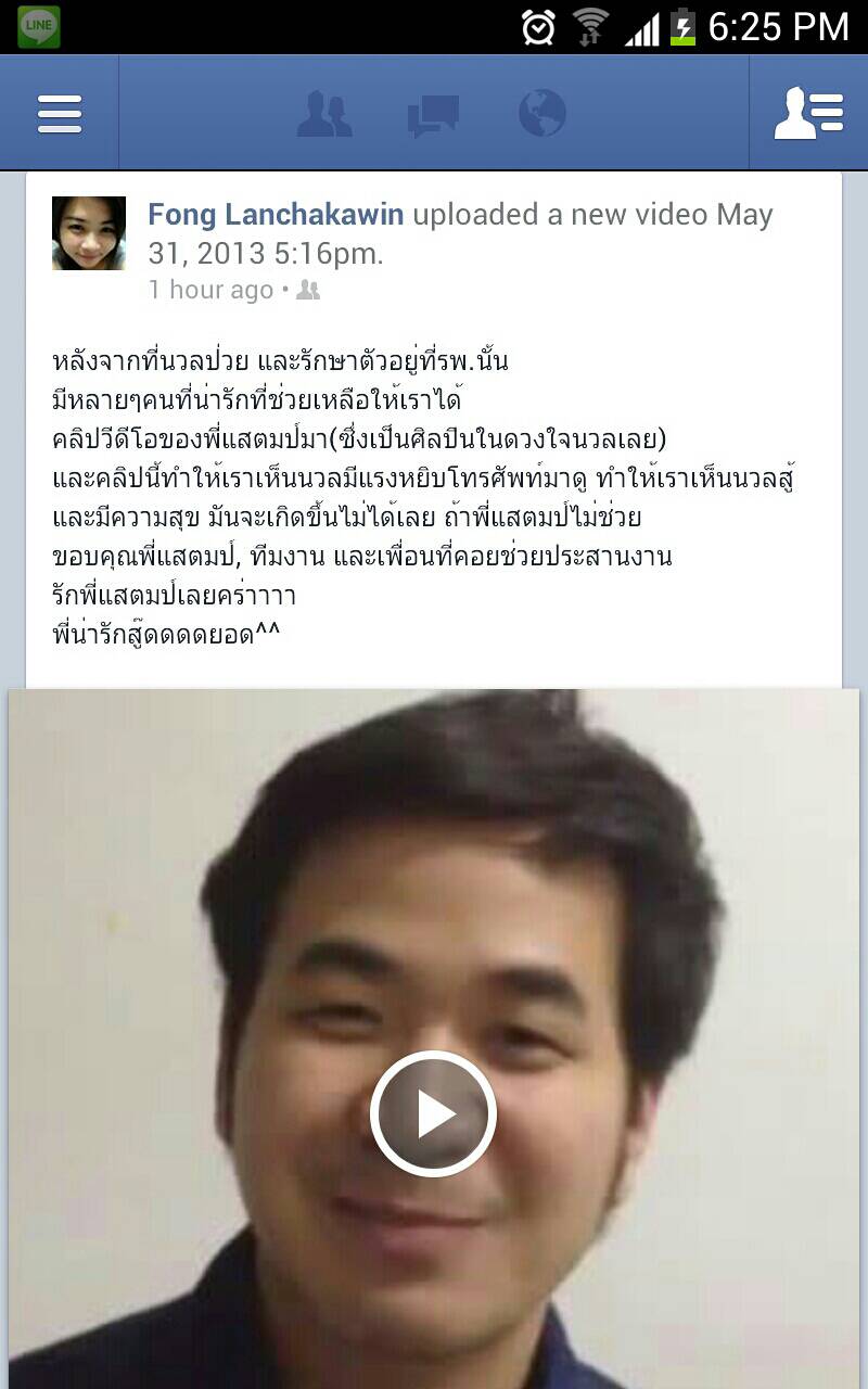 ผมได้โพสท์ขอความช่วยเหลือเนื่องจากเพื่อนของน้องที่รู้จักป่วยเป็นมะเร็งและมีอาการที่ไม่สู้ดีนัก จนมีหลายๆคนเข้ามาในกระทู้และช่วยเอากระทู้ไปให้เฮียอ่าน จนเฮียอัดคลิปส่งกำลังใจมาให้น้องในวันนี้เอง ล่าสุดน้องได้ดูคลิปที่เฮียส่งไปให้เรียบร้อยแล้ว ดูน้องมีรอยยิ้มและมีกำลังใจที่จะต่อสู้กับโรคร้ายนี้ต่อไป พลอยทำให้แม่ของน้อง รวมถึงคนรอบข้าง เพื่อนๆ มีรอยยิ้มไปกับน้องด้วย มันอาจจะเป็นสิ่งเล็กๆน้อยๆนะครับ แต่สิ่งเล็กๆน้อยๆนี้เป็นเหมือนพลังและกำลังใจที่ยิ่งใหญ่ที่ทำให้หลายๆคนมีรอยยิ้ม มีความสุข และทำให้น้องคนหนึ่งพร้อมที่จะต่อสู้กับโชคชะตาที่โหดร้ายต่อไป อยากจะขอขอบคุณทุกๆคนที่มีส่วนเกี่ยวข้อง ขอบคุณเฮียแสตมป์มากๆ ทีมงานที่มีส่วนเกี่ยวข้อง รวมถึงทุกคนในกระทู้นั้นที่พร้อมใจเข้ามาช่วยเหลือกันนะครับ ขอบคุณมากๆ ขอบคุณจริงๆ สิ่งเล็กๆน้อยๆนี้แหละที่ทำให้ผมรักเฮียแสตมป์มากขึ้น ไม่เสียแรงที่ติดตามผลงานมาตลอดระยะเวลาหลายปี รักเฮีย