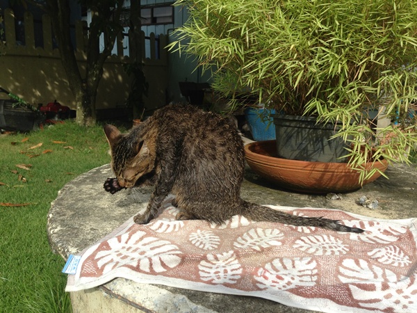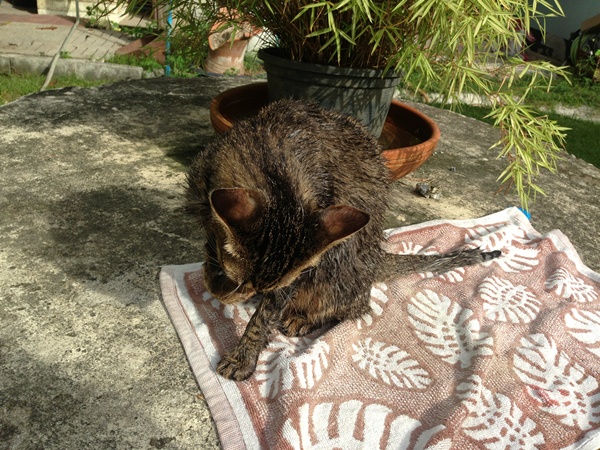 อาบเสร็จยังเช็ดตัวไม่แห้งดี เธอก็ไม่ยอมให้เช็ดล่ะ เลยปล่อยไปอาบแดด