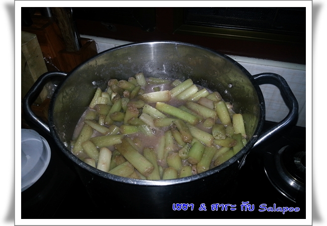 ต้มไฟกลางจนสายบัวยุบตัว ปรุงเค็ม หวาน เปรี้ยว