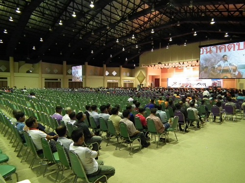 เชียงราย - เวที “เพื่อไทย..เพื่ออนาคตเพื่อประเทศไทย” ในหอประชุมมหาวิทบาลัยราชภัฏเชียงราย คึกคึกเฉพาะช่วงเริ่มต้น หลังเกณฑ์คนหมู่บ้านละ 20 คนเข้าร่วม แต่พอลงชื่อเสร็จชาวบ้านกลับหมด เหลือแต่เสื้อแดงขาประจำ และผู้ว่าฯ รวมหลักร้อย ทำ “อ๋อย-ตู่-เต้น” ต้องปราศรัยให้ผีฟัง