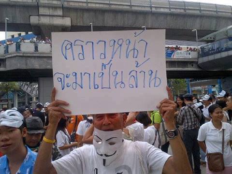 เมื่อเช้าฟังเจ้ปองทางบูตะกาย แล้วขนลุกขนพอง มีการสัมภาษณ์ผู้ริเริ่มนำหน้ากาก V มาเคลื่อนไหวไล่ระบอบทักษิณด้วย นึกในใจว่าครั้งนี้ยิ่งลักษณ์สงสัยจะอยู่ไม่ได้ เป็นห่วงนายกจับใจ เลยหยุดเล่นเน็ตไปงีบทำใจพักหนึ่ง ตื่นขึ้นมาเดินเลียบรั้วไปดูเชิงคนข้างบ้านเพราะไม่เห็นเปิดบูตะกายให้รับข่าวสารบ้างเลย