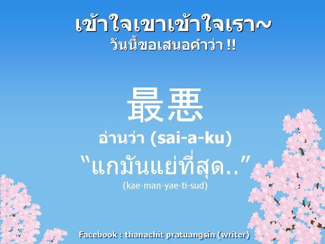 “อ้าว หนูจำได้พี่เคยบอก sai-a-ku แปลว่าขนาดใหญ่เกินไปไม่ใช่เหรอ !! ???? หนูจะบอกนายว่าแบบมันใหญ่เกินไป”