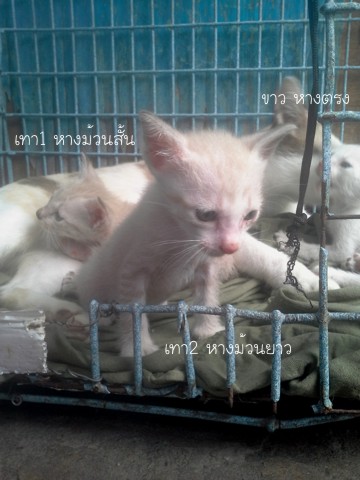 สีขาวหางตรง ตาฟ้า / สีเทาลายเสือ หางงอม้วนสั้น ตาฟ้า / สีเทาลายเสือ หางงอม้วนยาว ตาฟ้า