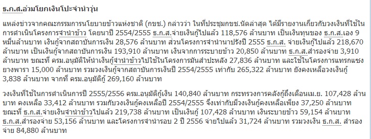 ผมไม่ได้ ต่อต้านโครงการจำนำข้าวนะครับ เพราะเป็นการยกระดับ ความเป็นอยู่ของประชาชนส่วนใหญ่ของประเทศ และเงินที่จำนำไปส่วนหนึ่งมันก็วนเข้ามาสู่ระบบเศรษฐกิจ แต่เพราะว่า ราคาตลาดโลกที่ต่ำกว่า ราคาจำนำข้าวบ