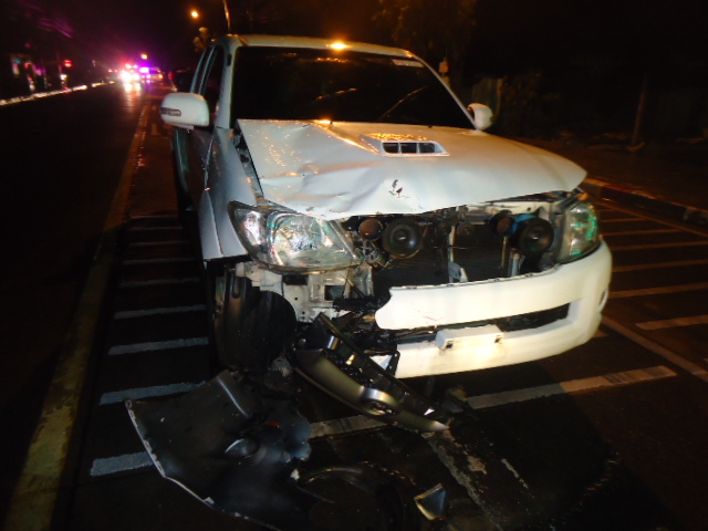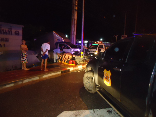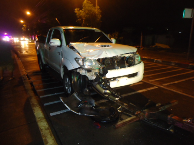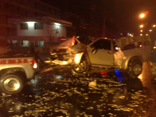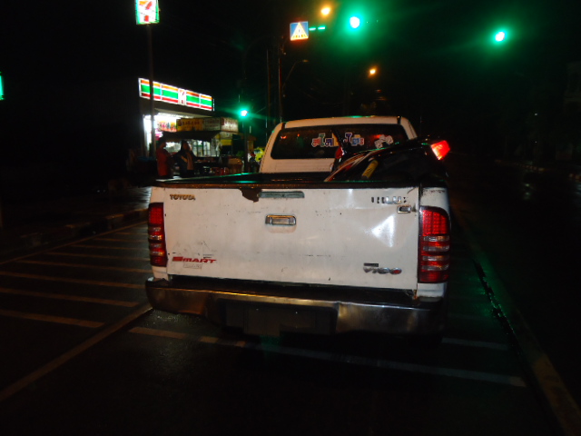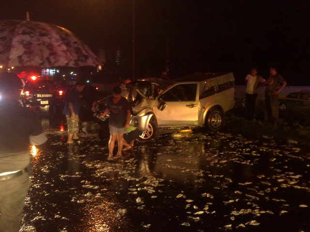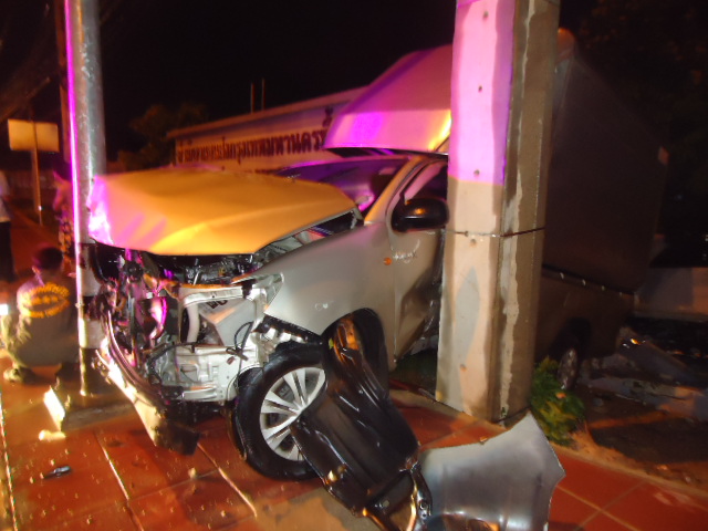 ตี 4 หน้าขนส่ง ถนนเทียนทะเล คงจะรีบมาสอบใบขับขี่ เลยพลาด จัดหนักหน้าขนส่งเลย ฝนตกถนนลื่น รถกระบะโรงงาน บวกกับ เมาแล้วขับ เพราะได้กลิ่นเหล้าหึ่งเลย เลยเสียหลัก ชนเสาไฟฟ้าครับ เถ้าแก่มาเห็น เดาไม่ถูกเลย จะรู้สึกอย่างไง