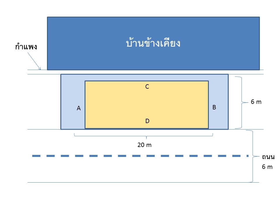 โดยพื้นที่ด้าน A และ B ต้องการสร้างพื้นที่มีช่องแสงซึ่งจะทำให้งกับที่ข้างเคียง 2 เมตร และ พื้นที่ด้าน C จะทำเป็นผนังทึบ ซึ่งมีระยะงจากขอบรั้ว 0.5 เมตร ซึ่งตามความเข้าใจของผมการเว้นระยะงดังกล่าวสามารถทำได้ถูกต้องตามกฏหมาย (ถ้าผมเข้าใจไม่ผิด) ปัญหาจะอยู่ที่พื้นที่ด้าน D ซึ่งติดถนน ซึ่งผมอยากถามทุกท่านตามนี้ครับ