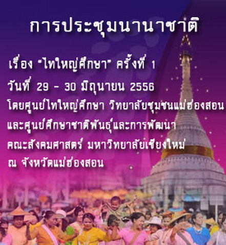 วันที่ ๒๙ – ๓๐ มิ.ย.๕๖ ศูนย์ไทใหญ่ศึกษา วิทยาลัยชุมชนแม่ฮ่องสอน และศูนย์ศึกษาชาติพันธุ์และการพัฒนา คณะสังคมศาสตร์ มหาวิทยาลัยเชียงใหม่ จะจัดให้มี การประชุมนานาชาติ ครั้งที่ ๑ เรื่อง “ไทใหญ่ศึกษา” ที่ วิทยาลัยชุมชนแม่ฮ่องสอน